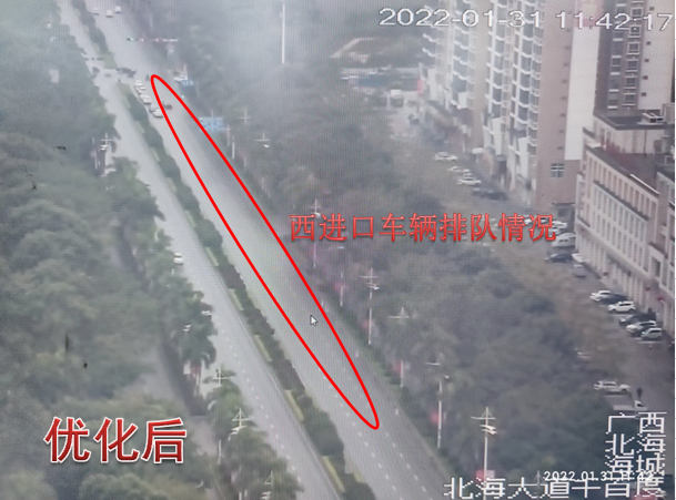 巡查北海市进出城重点路口,发现早平峰时段西往东方向较为拥堵,存在二次排队的现象,影响通行效率,针对此情况,在不影响北海大道(南珠大道-西藏路)绿波带的前提下,结合调研数据,对该路口进行配时优化调整,增加东西直行的绿信比,并设置了排队车辆消散时间,提前清空路口排队车辆,消除了二次排队现象,也达到了绿波预期效果,提高了通行效率。