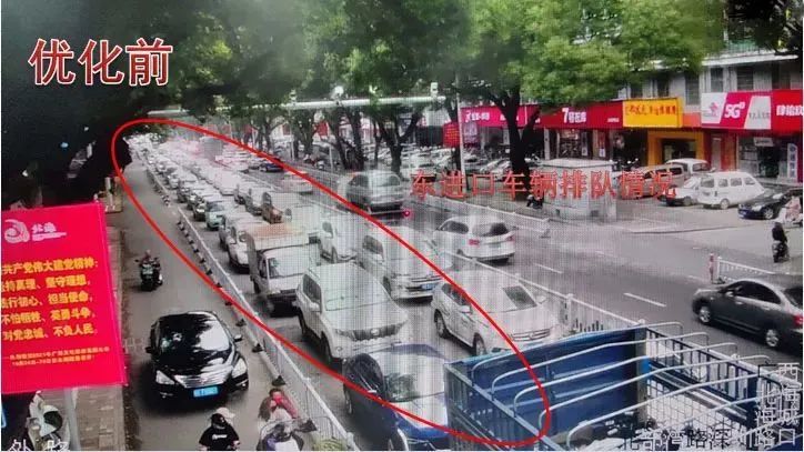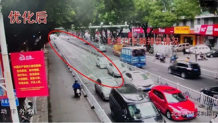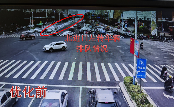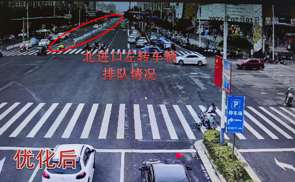 巡查发现平峰期间北进口左转车辆存在二次排队现象,进入万达、吾悦商业圈的车流量较大,东西左转存在空放,针对此情况,在不影响广东路(新世纪大道-金海岸大道)绿波带的前提下,结合调研数据,对该路口进行配时优化调整,增加南北左转放行时间,缩减东西左转放行时间,消除了南北左转二次排队现象,并解决了东西左转空放的问题,提高了路口通行效率。