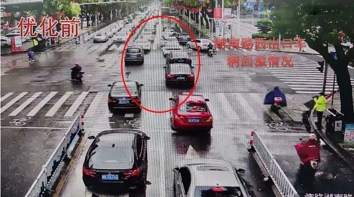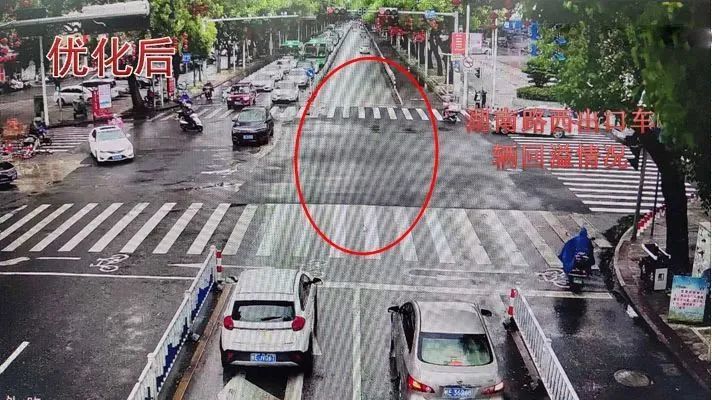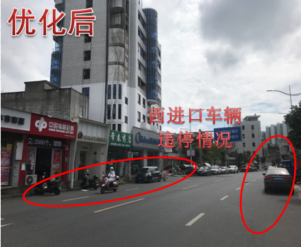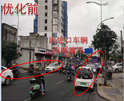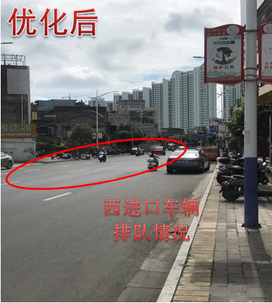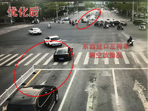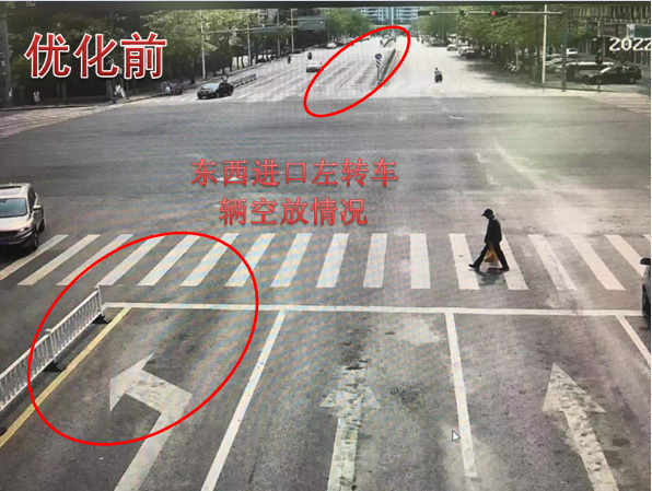 巡查发现西进口的道路资源有限,实际可通行车道只有一车道,导致西进口车辆排队较长,原配时方案及划分时段单一,早晚高峰西进口放行时间不足,西侧有学校,上下学期间路侧停留车辆较多,有车辆违停在路边,影响车辆通行效率,针对此情况,因此结合调研数据,重新划分多时段,精细化配时方案,在不增大周期的前提下,为缓解西进口交通压力,由于东西左转车流较小,在东单放与西单放相位之间,搭接早晚高峰时段增加一个东西直行放行相位,再配合民警交通道路管制,治理违停车辆,提高路口整体通行效率。