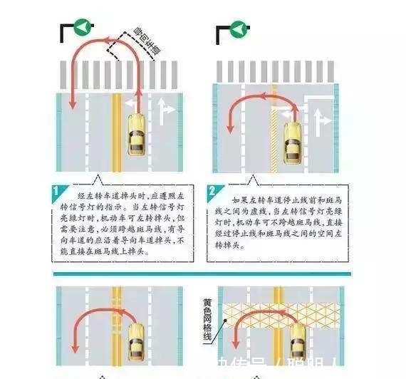 第四种也是很多车主容易犯错误的情况,我们应该都知道,在黄色网格线上是不允许停车的,但是黄色网格线上是允许掉头的。但是有一种情况要注意,如果是绿灯快要结束的时候,我们进行掉头,刚好红灯了,于是就停在网格线上,这样就不允许了。
